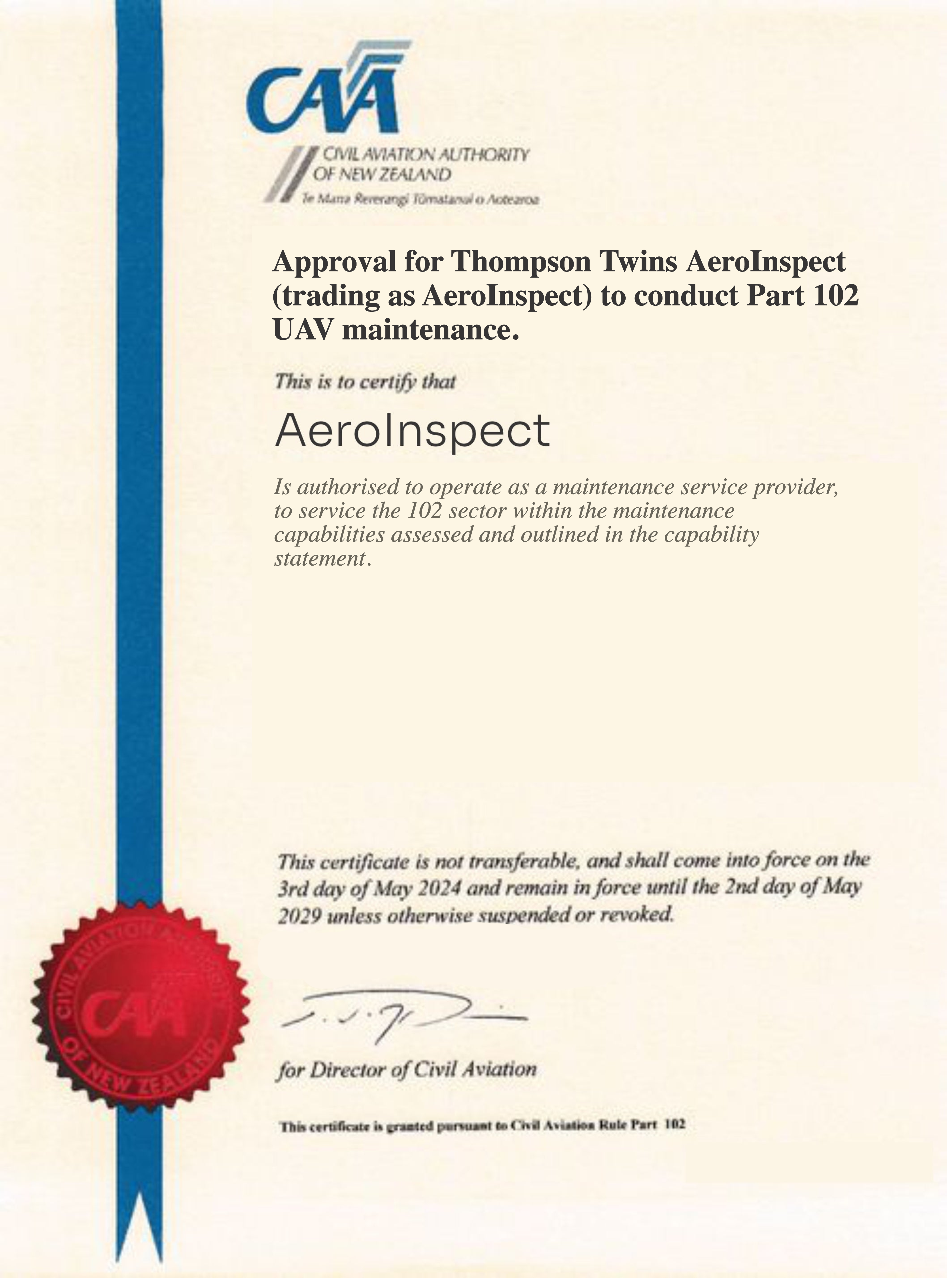 AeroInspect operates under CAA Part 102 Unmanned Aircraft Operator Certificate to deliver advanced UAV operations.